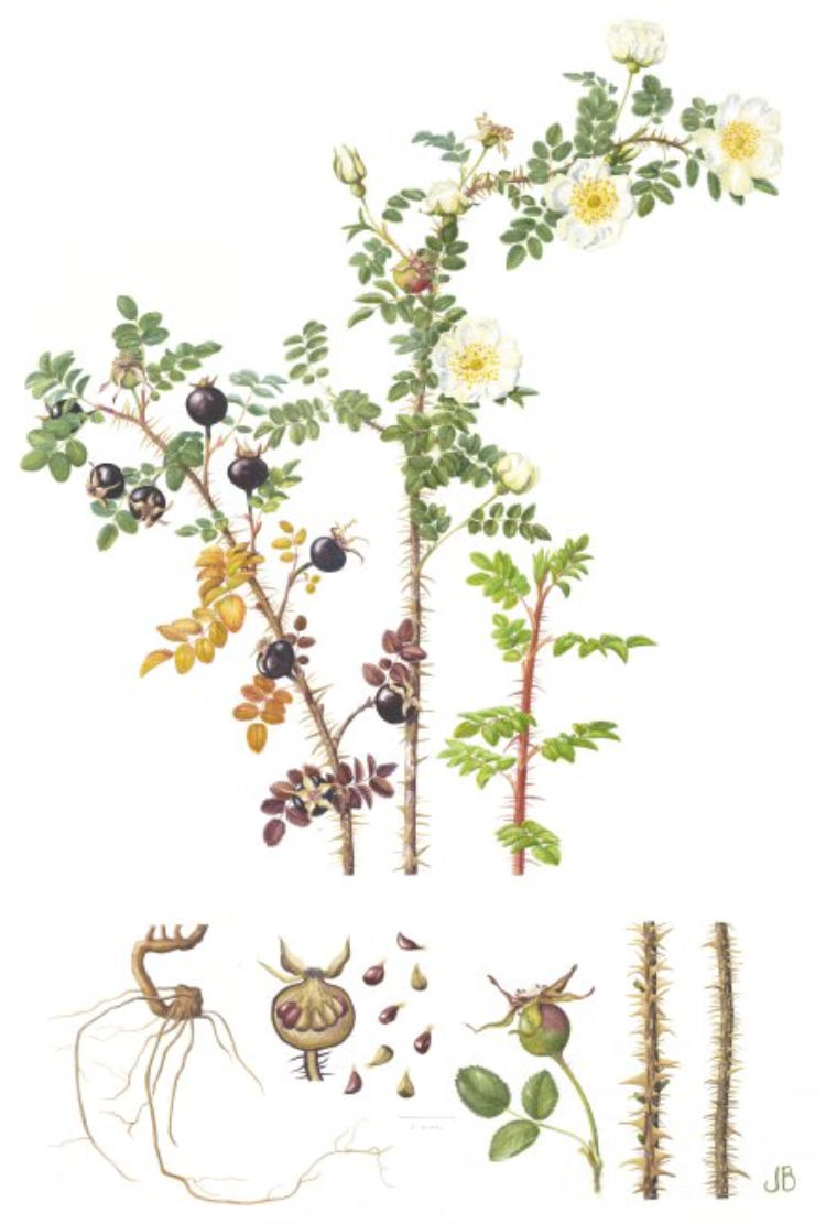 edges of the freshwater pond and marsh. Also known as the Scottish rose. It has black rosehips and is